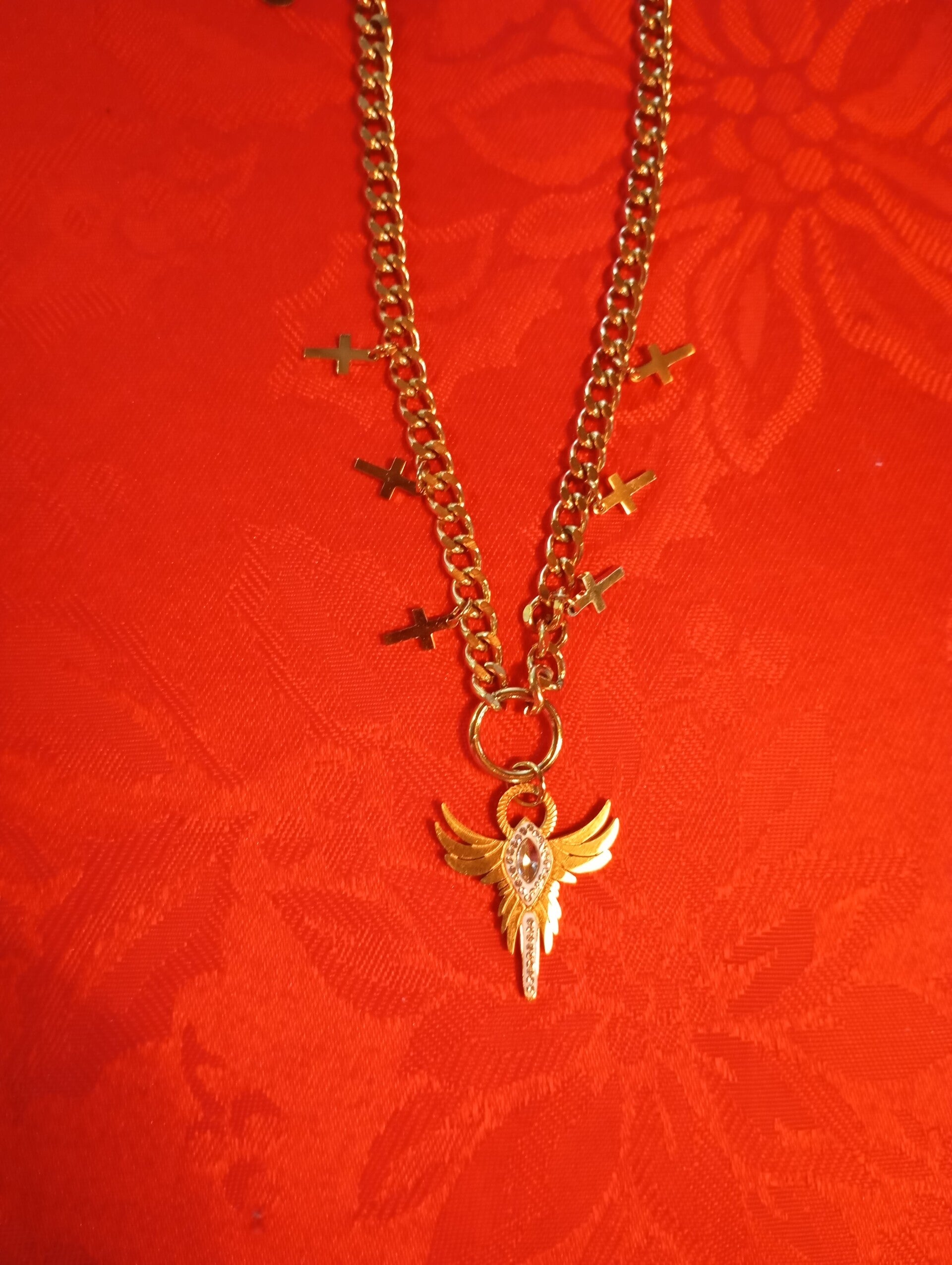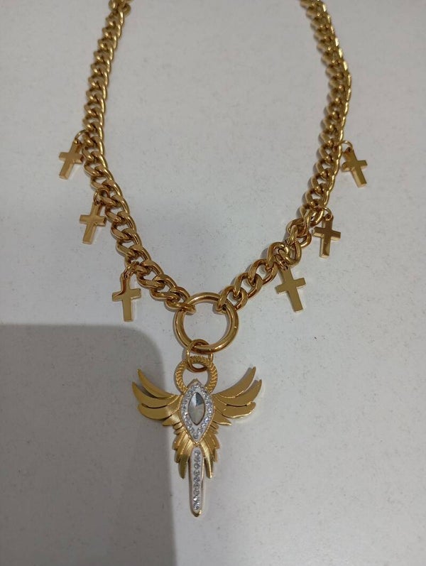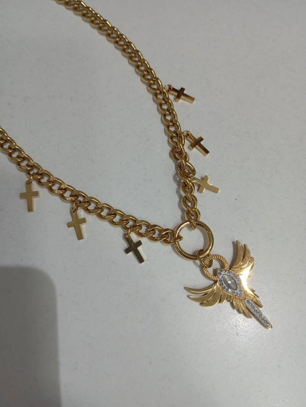 Απίστευτο κολιέ με όγκο και προσωπικότητα ατσάλινο με άγγελο στην μέση και έξι σταυρούς.